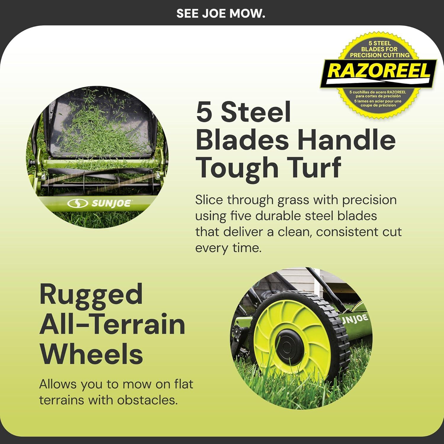 Sun Joe Lawn Mower, 16 Inch Manual Reel Push Behind Machine, Outdoor Equipment with Removable Grass Catcher and Adjustable Cutting Height(18 in)